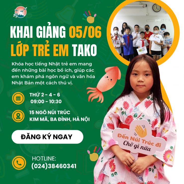 Thông báo khai giảng lớp học Tiếng Nhật cho trẻ em Tako - Ngày khai giảng: 05/06/2024 - Địa Điểm: Trung tâm tiếng Nhật Núi Trúc – Sugi Ryotaro - Số 15 Ngõ Núi Trúc, Kim Mã, Ba Đình, Hà Nội